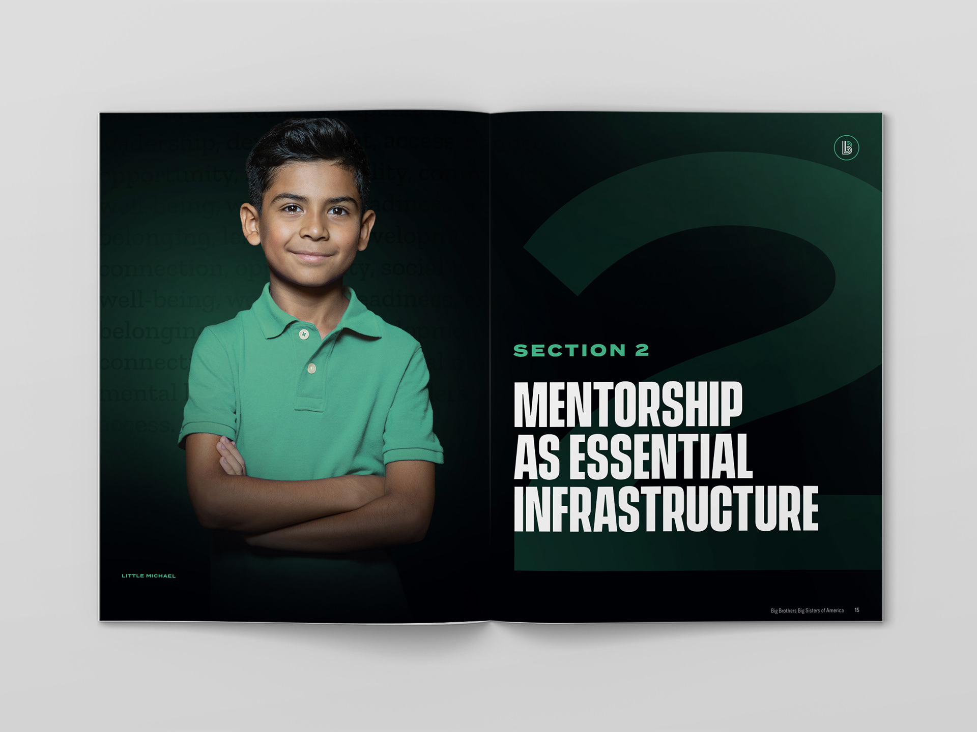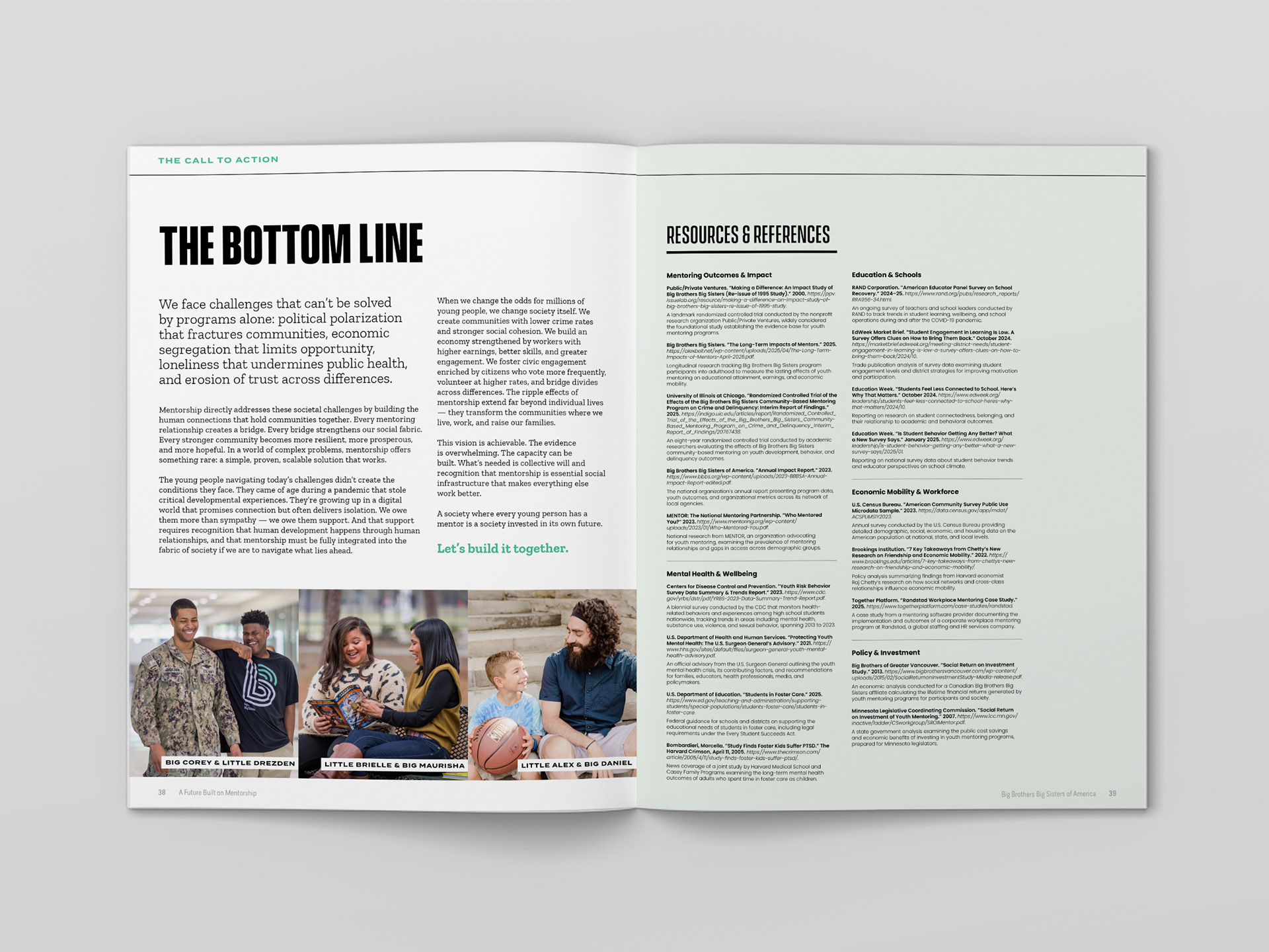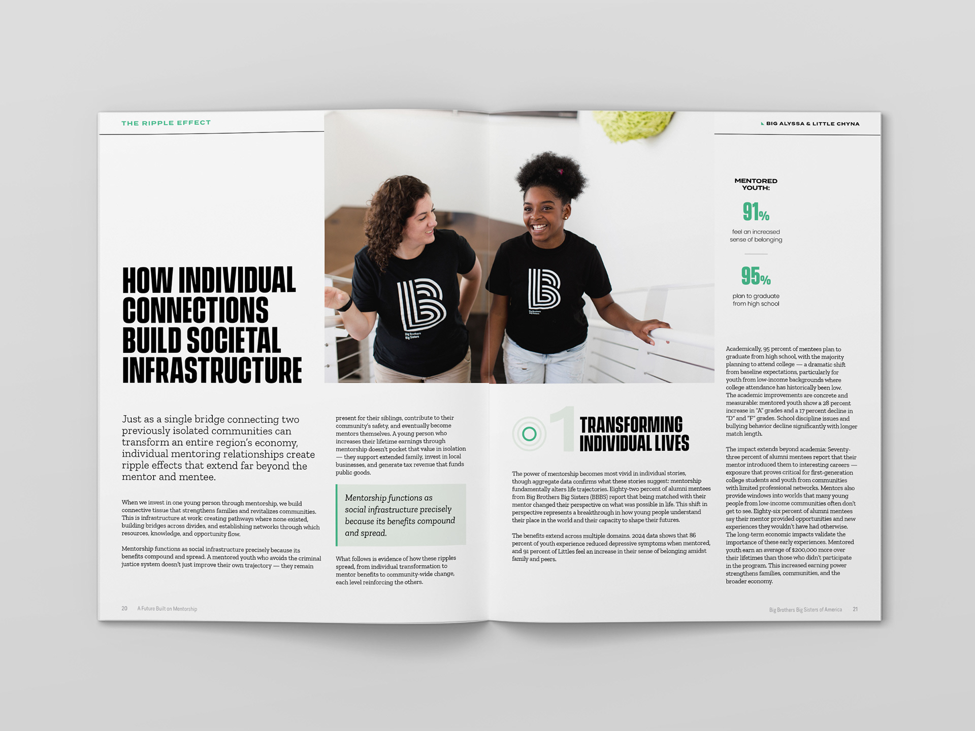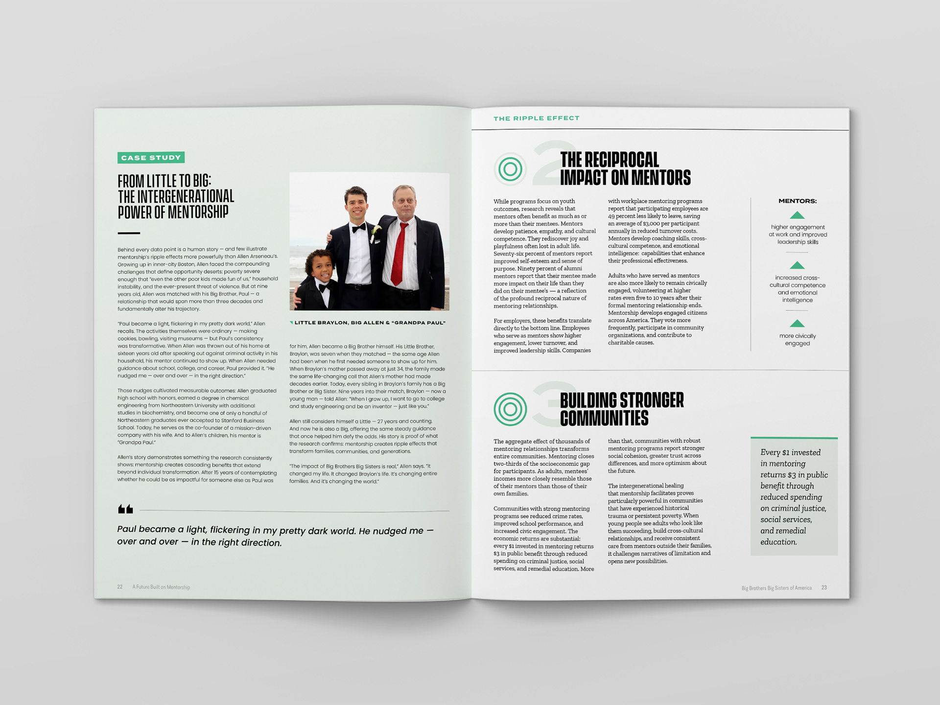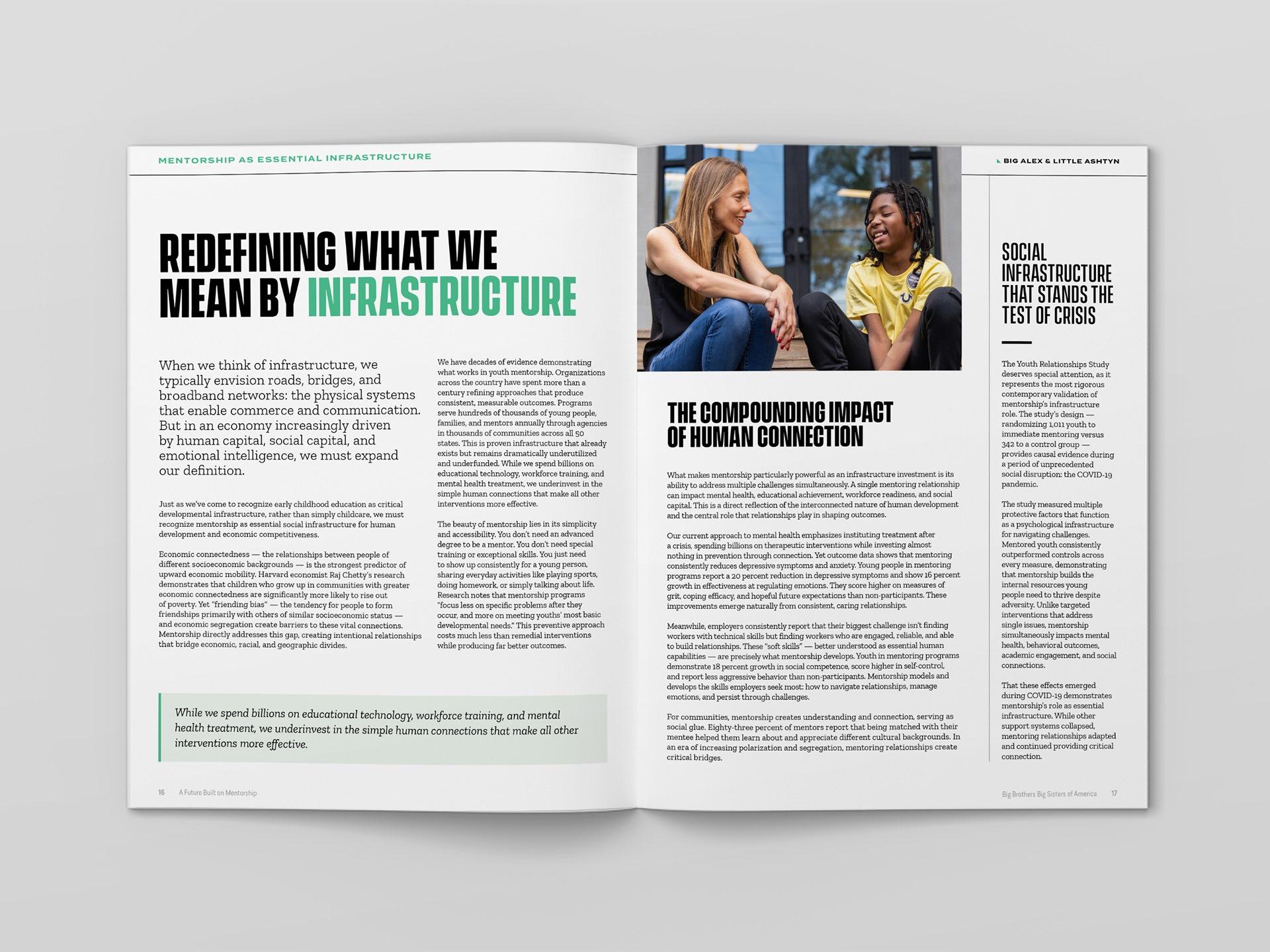 Big Brothers Big Sisters of America’s 40-page impact report positions mentorship as foundational to America’s future. The report reframes mentorship as what it truly is: essential infrastructure for a resilient workforce, strong communities, and long-term economic vitality. This industry-shaping report not only outlines BBBSA’s work in creating meaningful, measurable change for young people—it sets the stage for larger investments and partnerships to support mentorship now and in the coming decades. I was honored to design such an important piece.