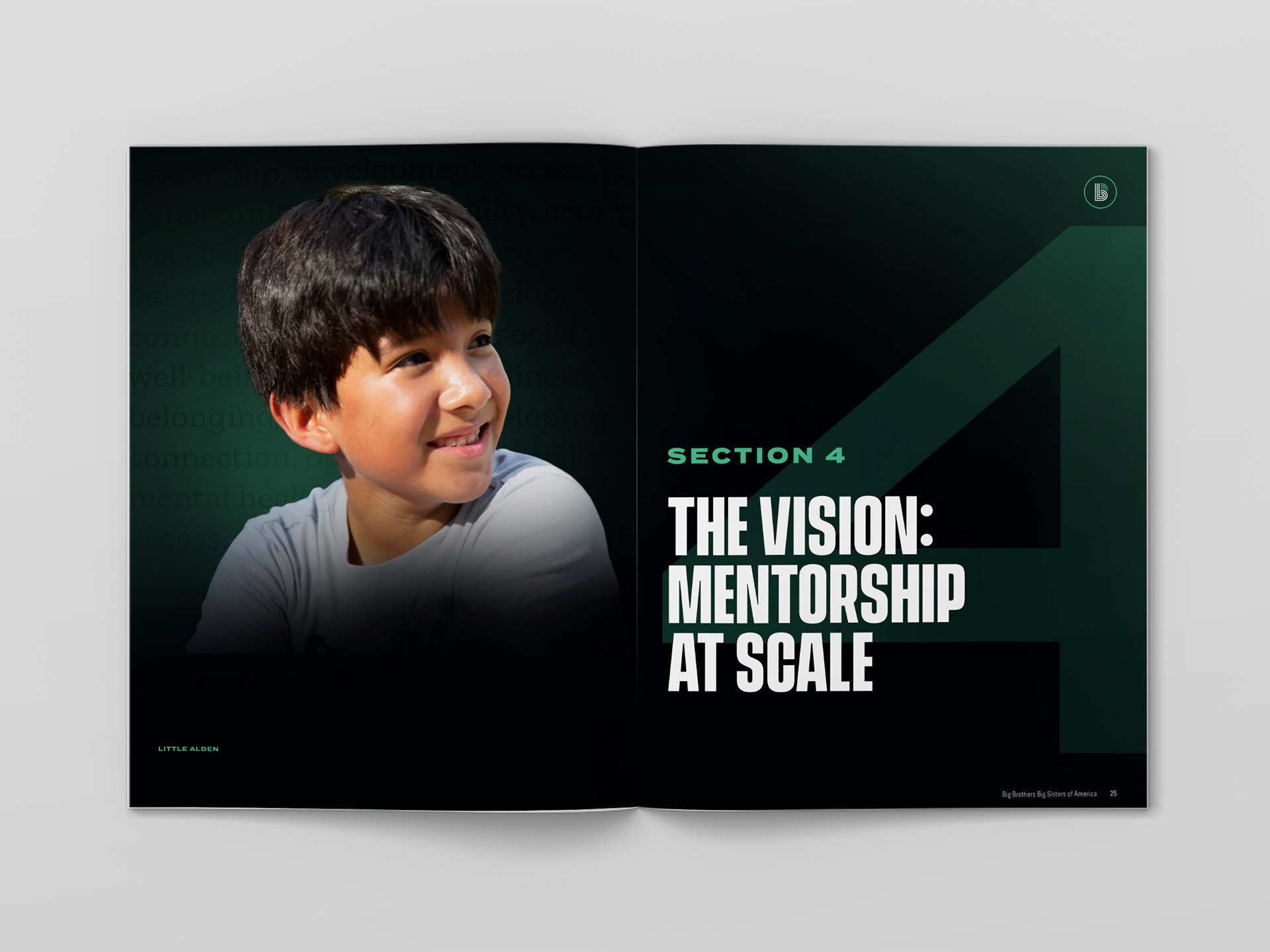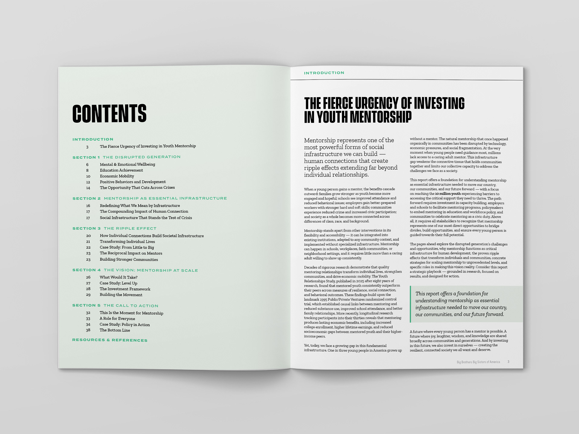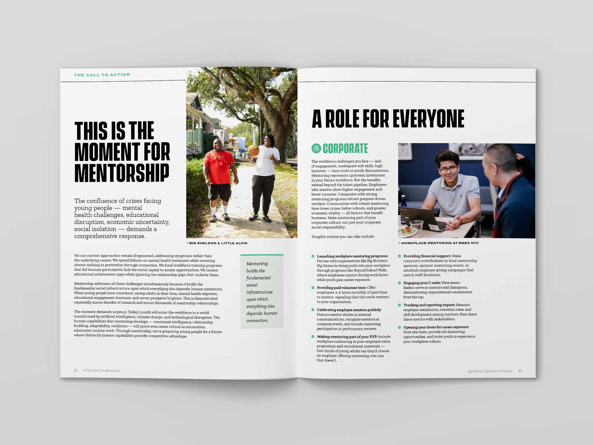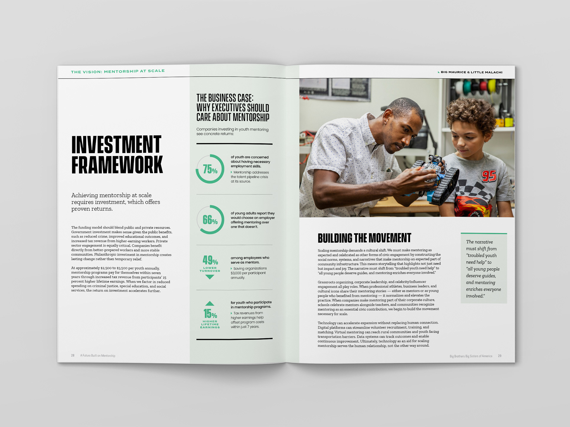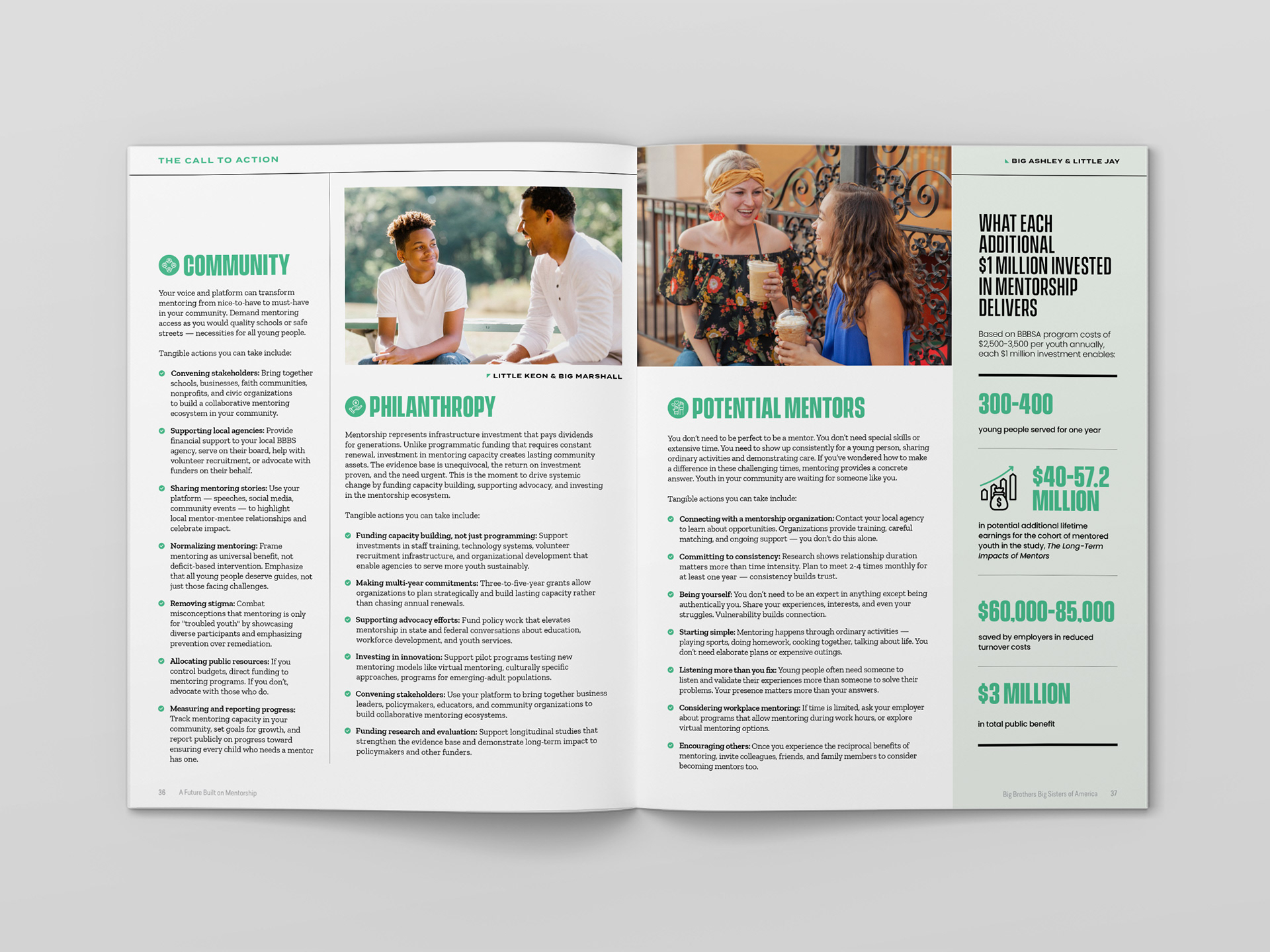 Big Brothers Big Sisters of America’s 40-page impact report positions mentorship as foundational to America’s future. The report reframes mentorship as what it truly is: essential infrastructure for a resilient workforce, strong communities, and long-term economic vitality. This industry-shaping report not only outlines BBBSA’s work in creating meaningful, measurable change for young people—it sets the stage for larger investments and partnerships to support mentorship now and in the coming decades. I was honored to design such an important piece.