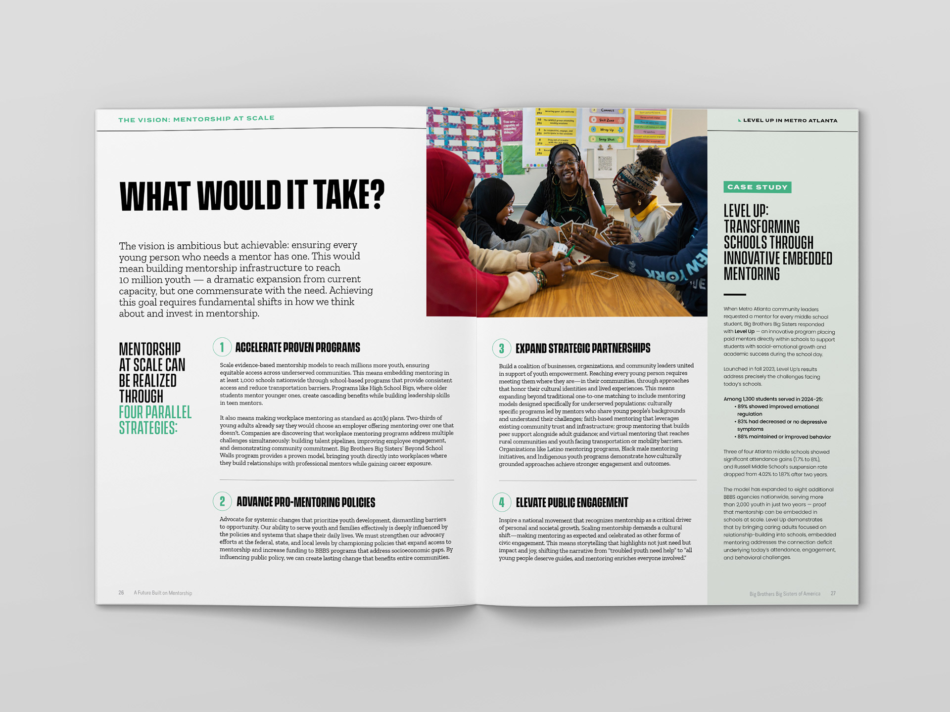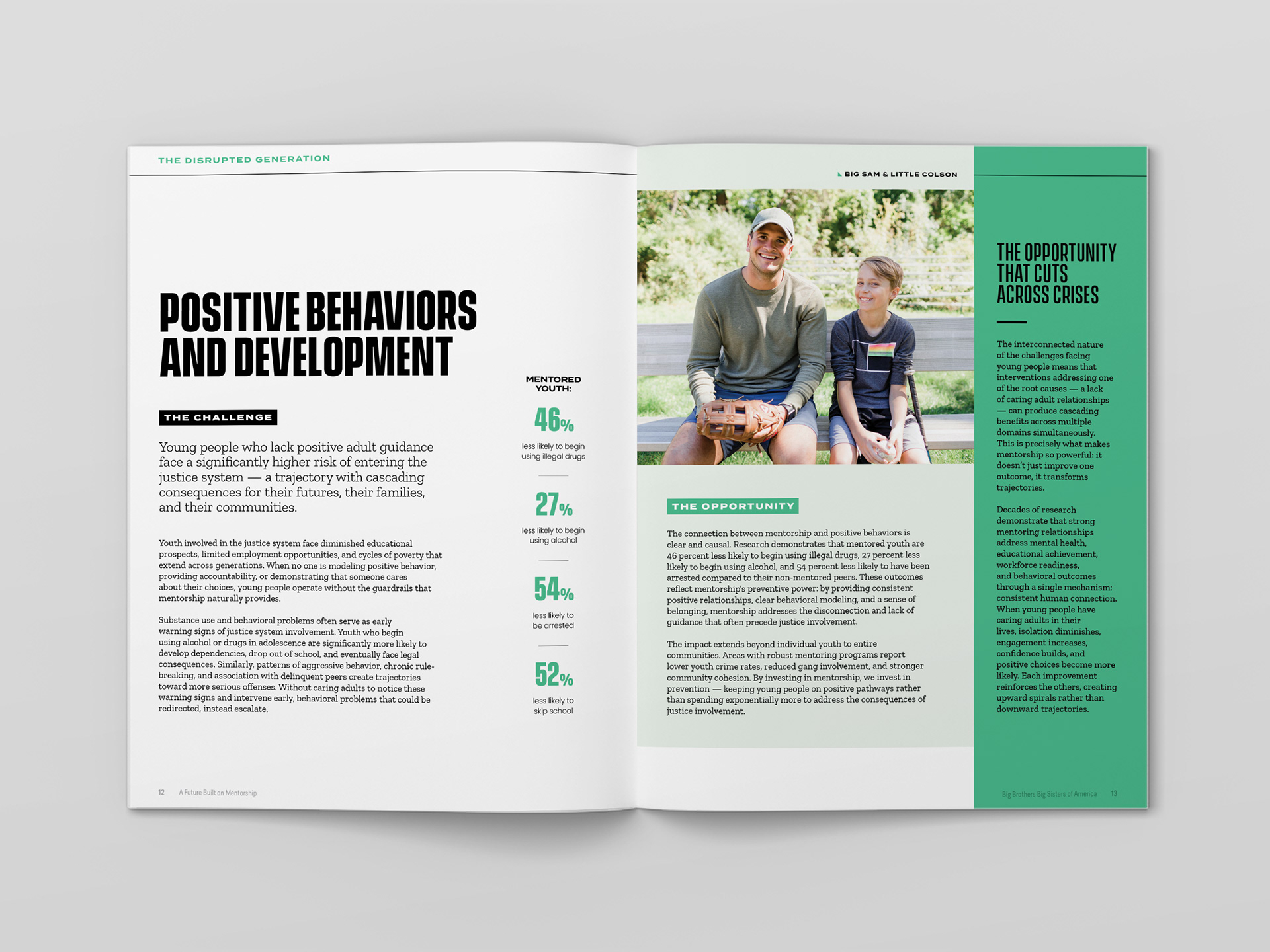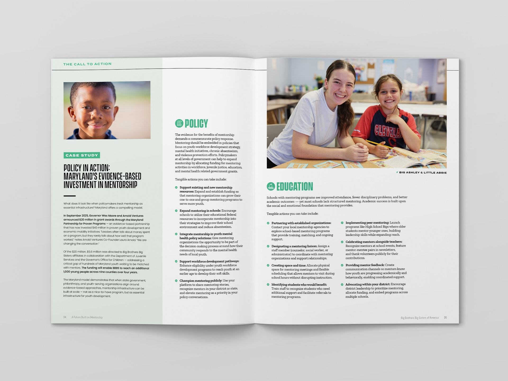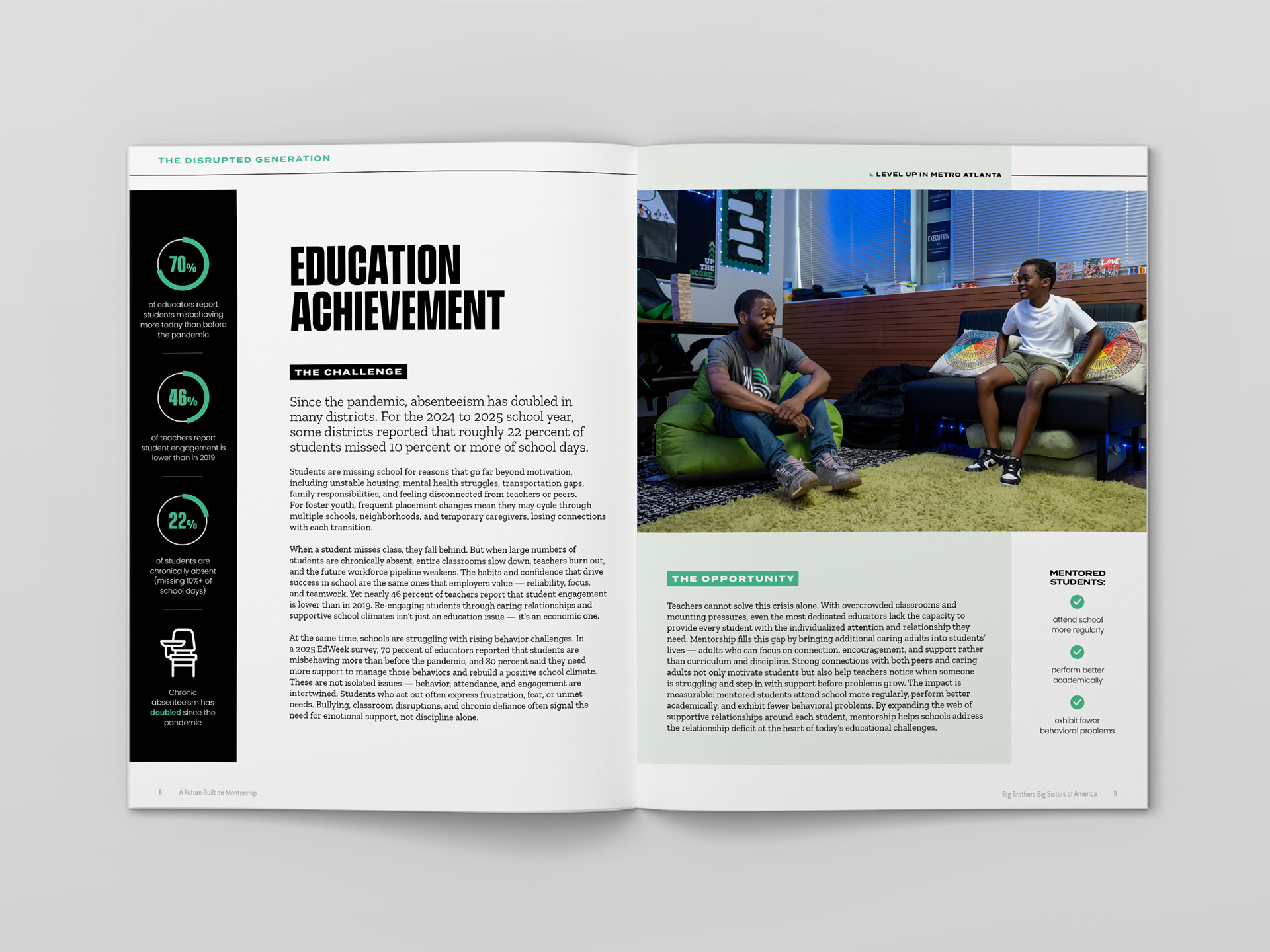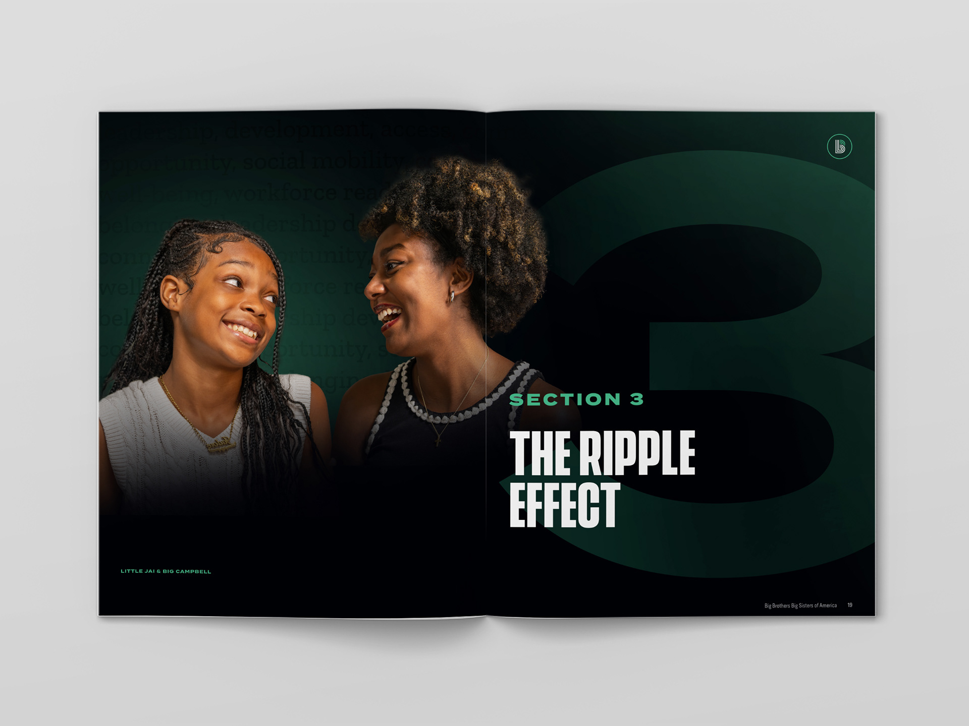 Big Brothers Big Sisters of America’s 40-page impact report positions mentorship as foundational to America’s future. The report reframes mentorship as what it truly is: essential infrastructure for a resilient workforce, strong communities, and long-term economic vitality. This industry-shaping report not only outlines BBBSA’s work in creating meaningful, measurable change for young people—it sets the stage for larger investments and partnerships to support mentorship now and in the coming decades. I was honored to design such an important piece.