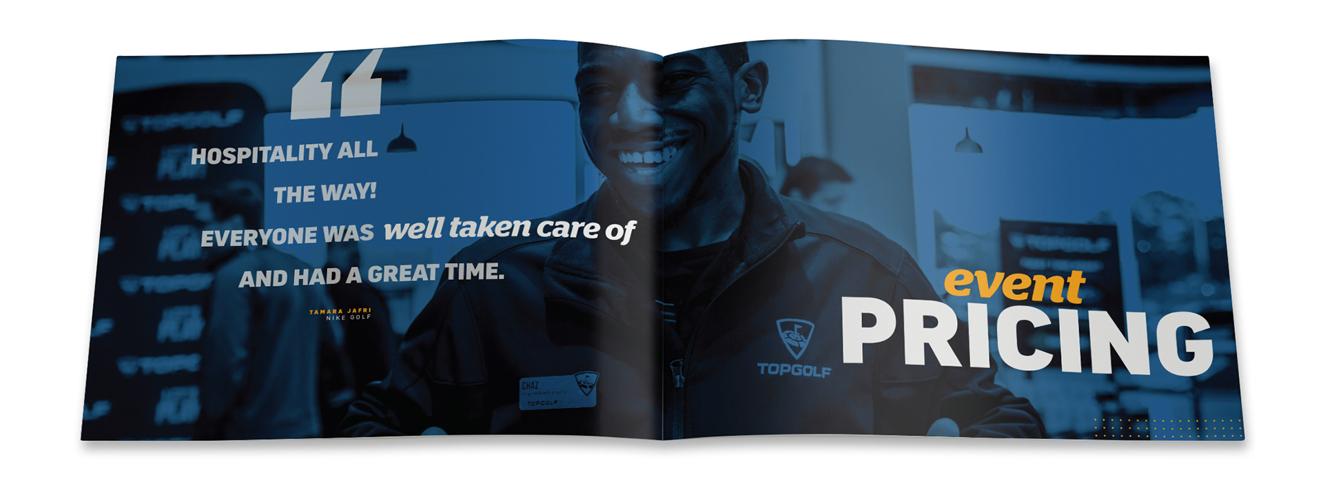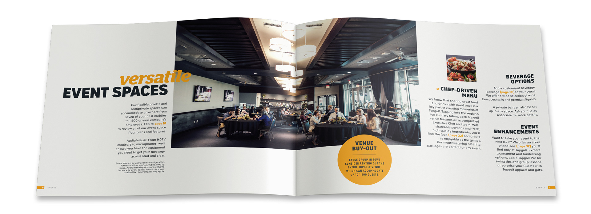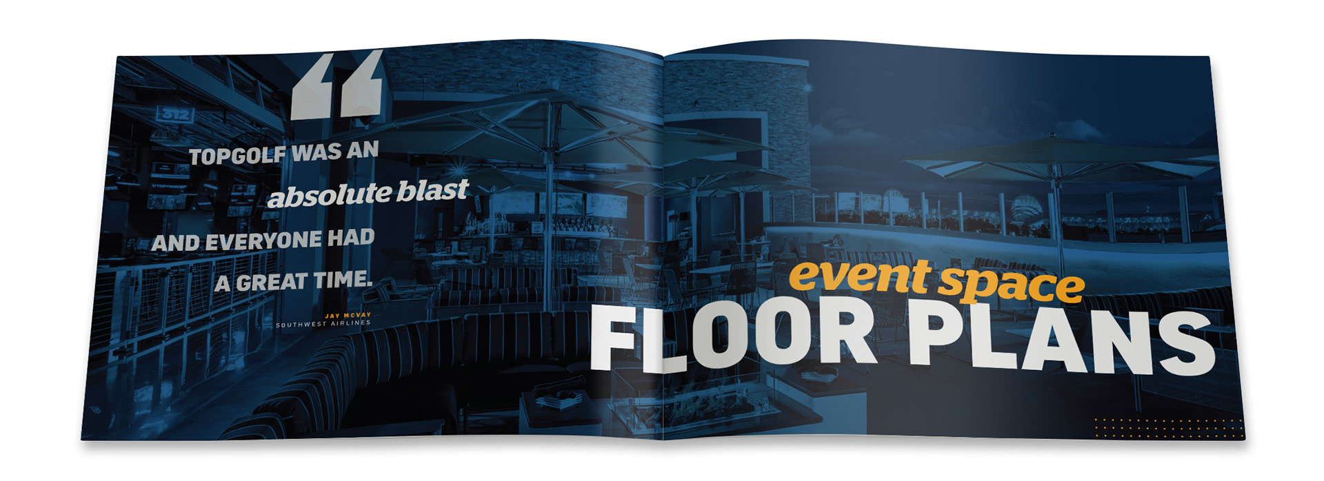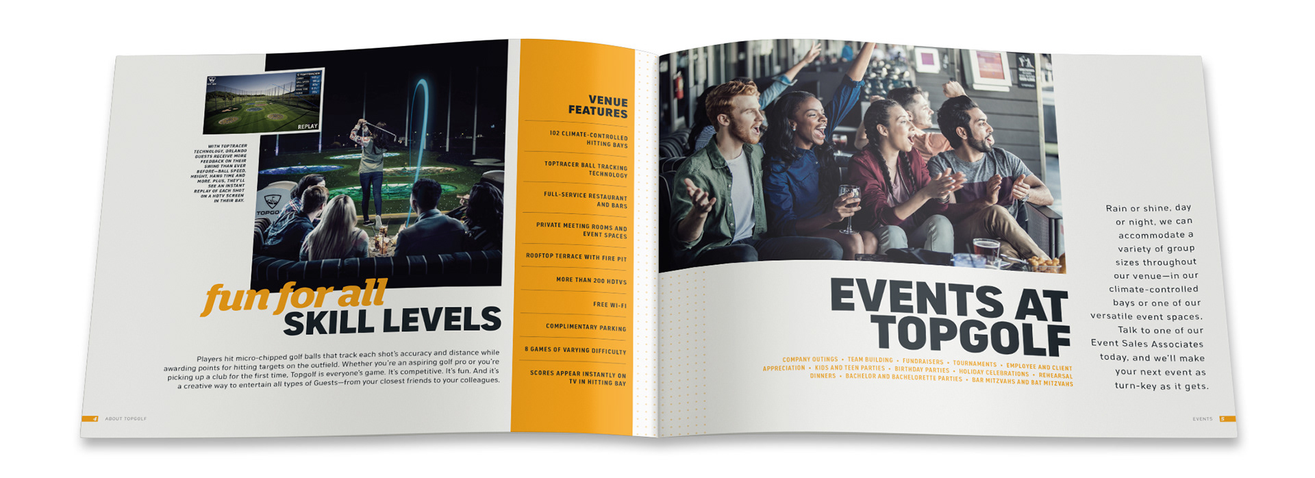 From pagination to press checks, I quarterbacked the entire production of these comprehensive sales tools. Each Topgolf venue in the U.S. (there are 50+) received a custom guideĀ tailored to its specific event offerings.