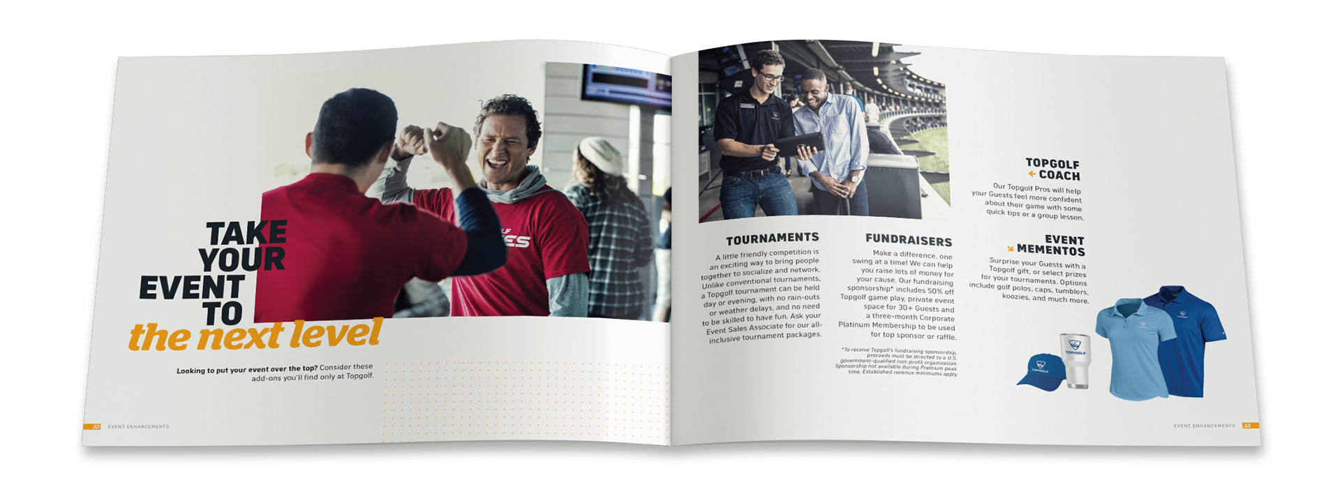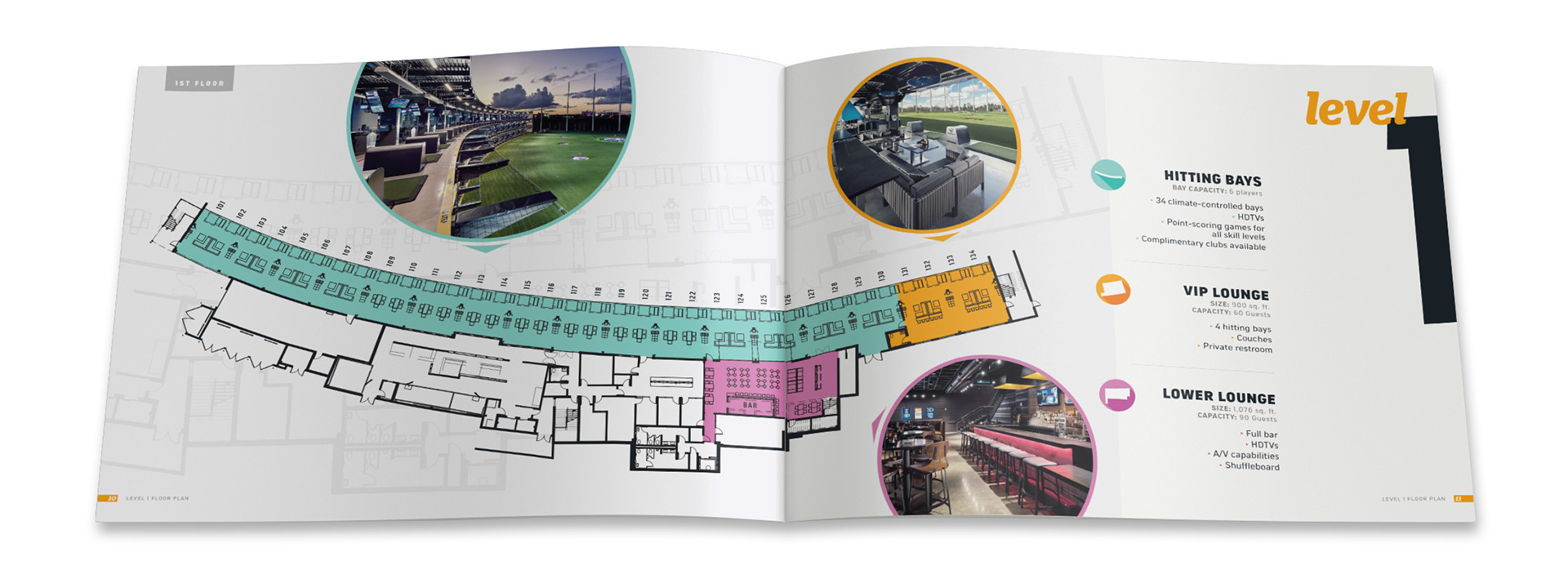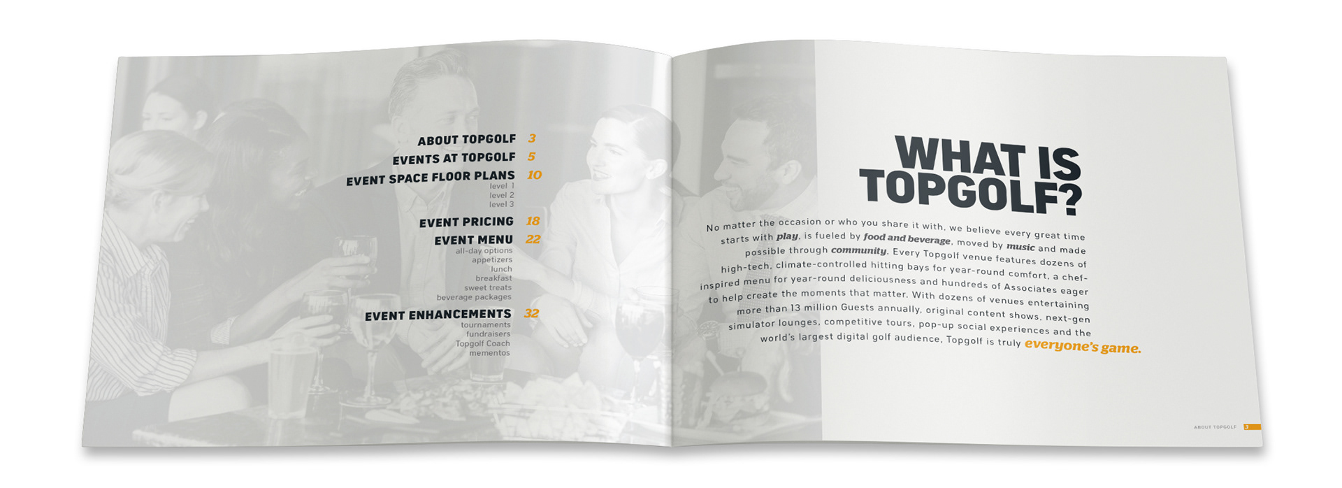 From pagination to press checks, I quarterbacked the entire production of these comprehensive sales tools. Each Topgolf venue in the U.S. (there are 50+) received a custom guideĀ tailored to its specific event offerings.