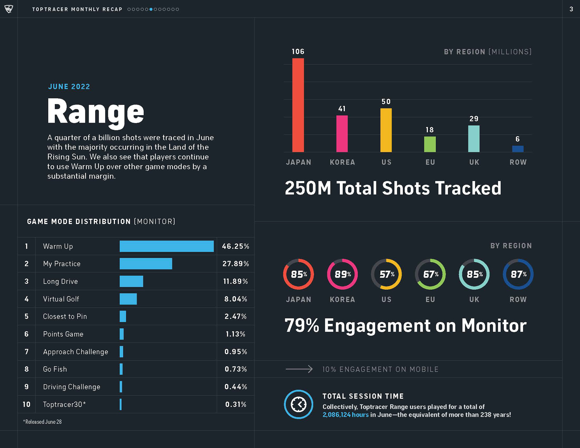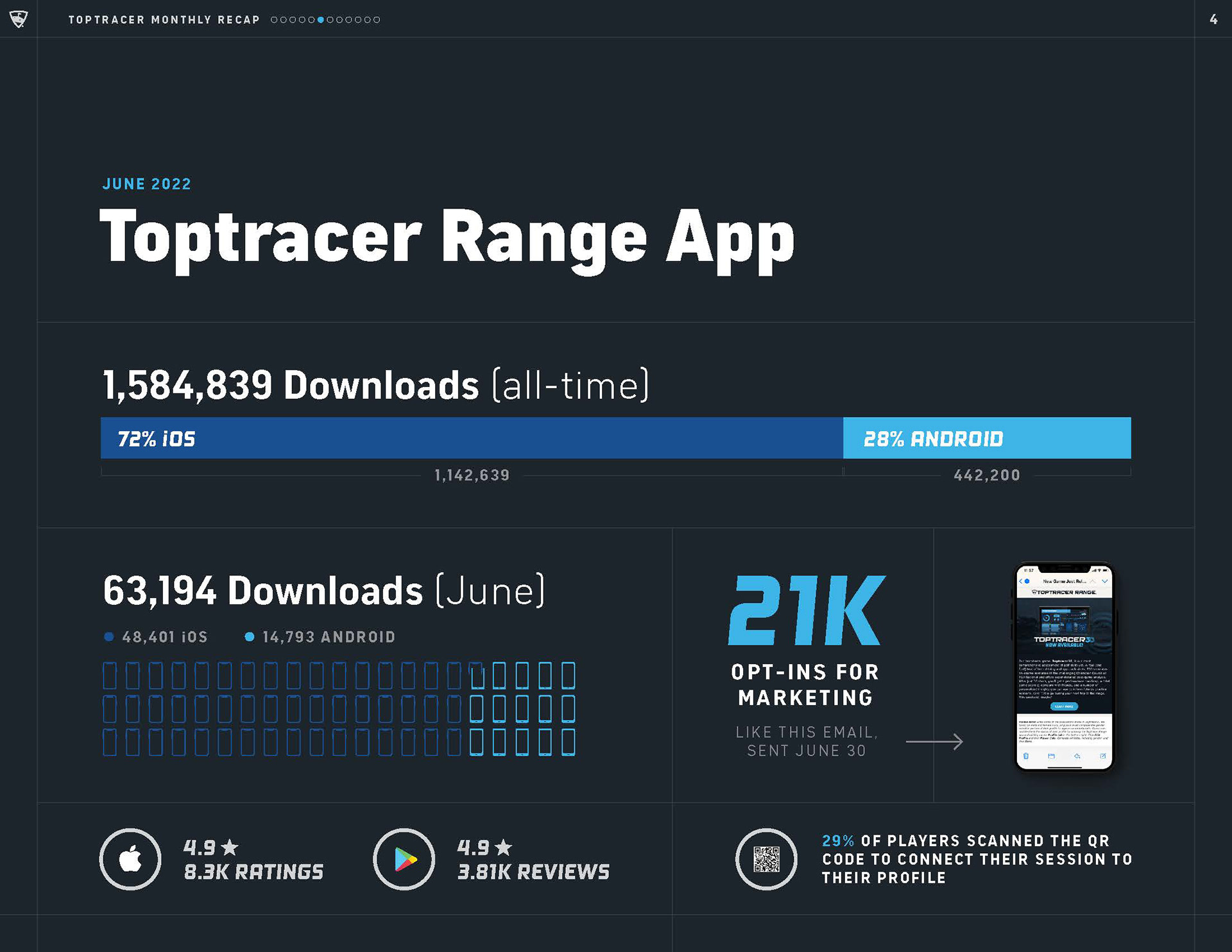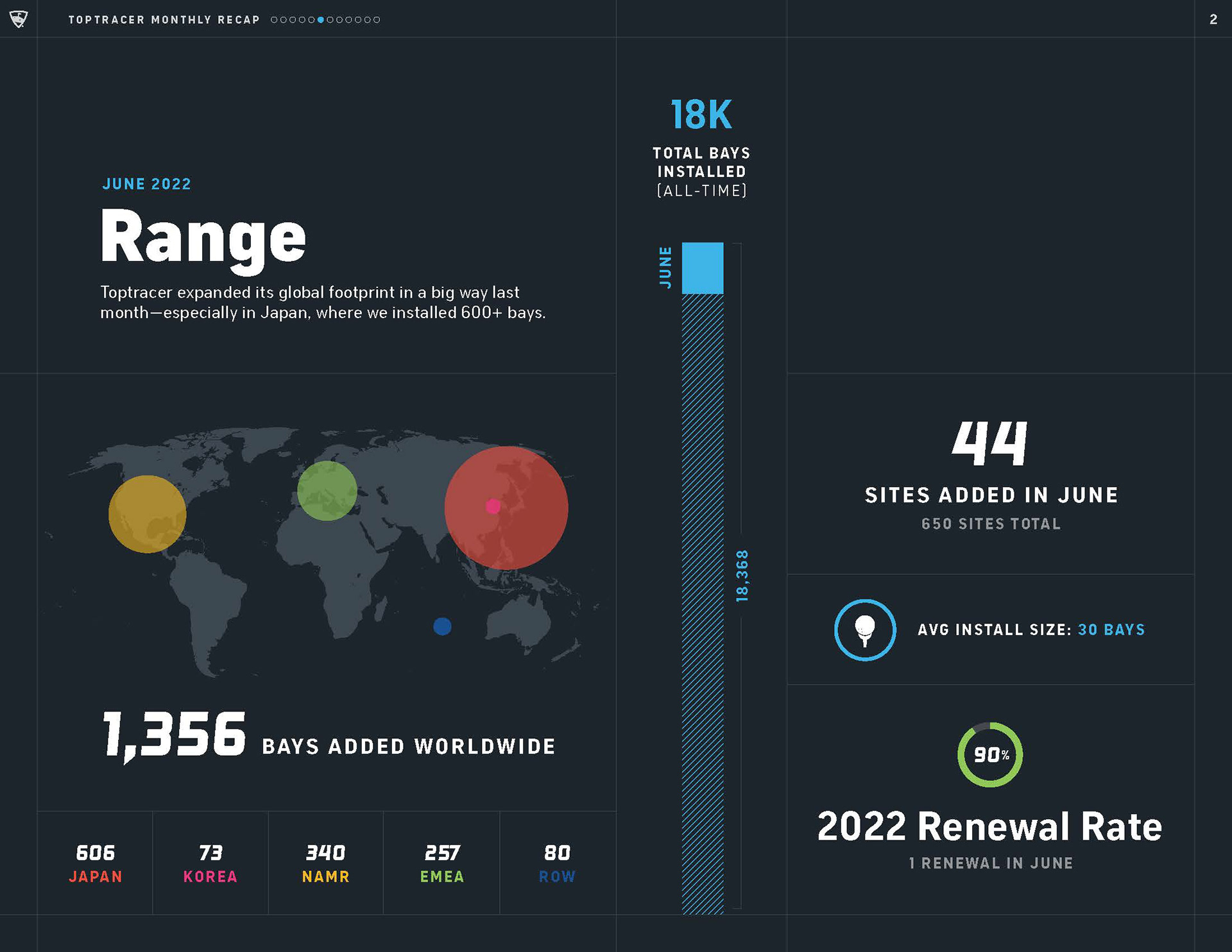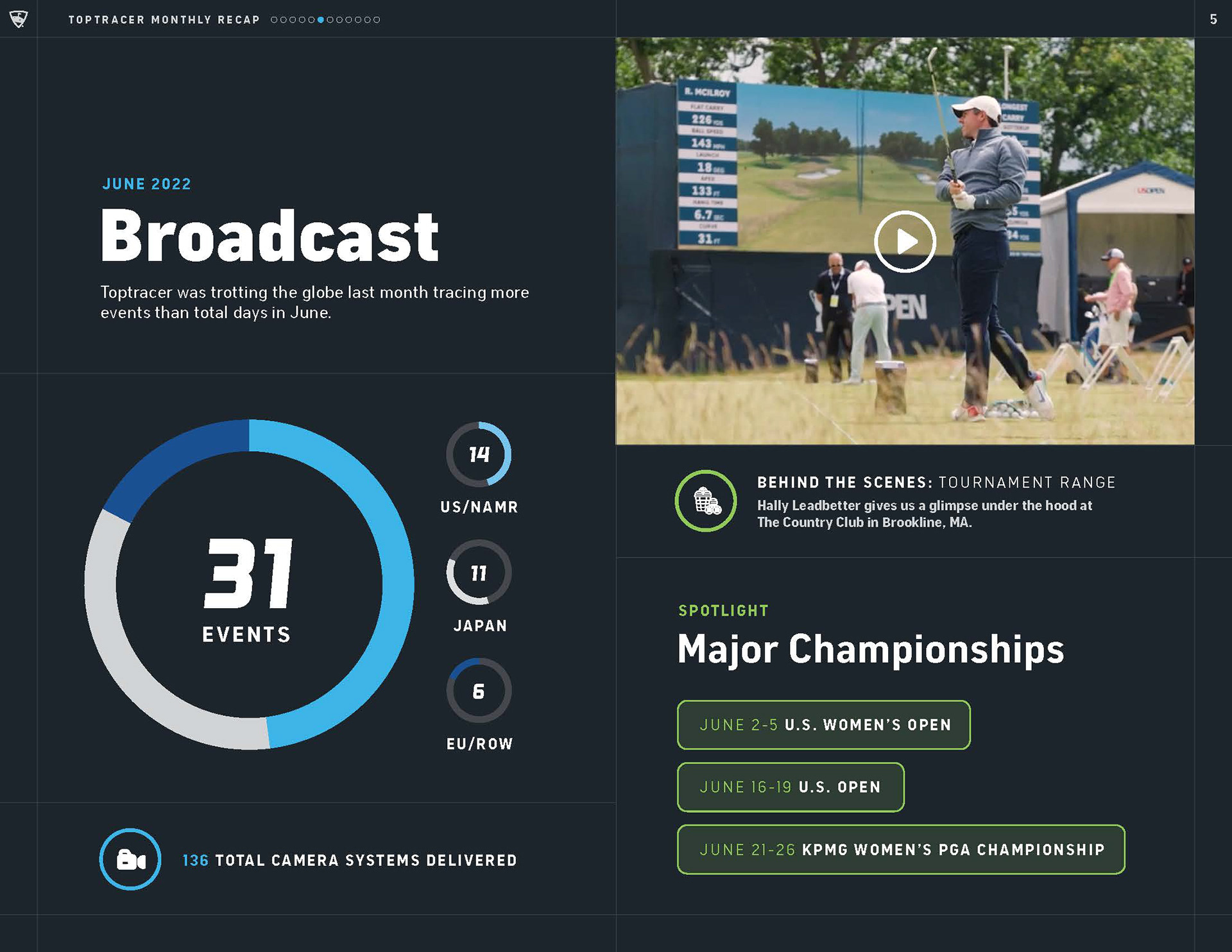 I was tapped to lead the creative vision and establish a consistent brand identity for Toptracer, a ball-tracing technology acquired by Topgolf in 2016. Today, Toptracer is a global brand, seen on hundreds of golf broadcasts worldwide and installed at nearly 1,000 driving ranges in more than 32 countries. It's the most-used ball-tracing technology in golf.